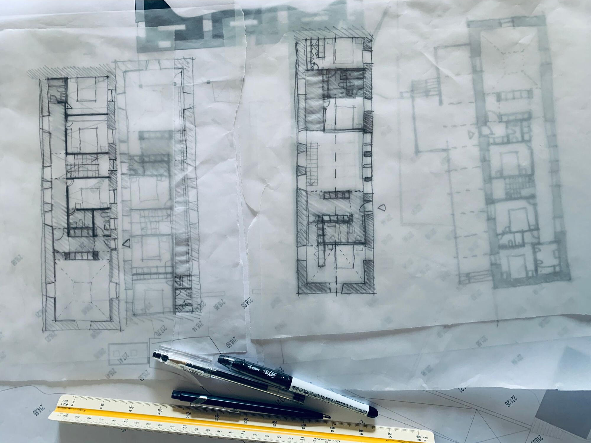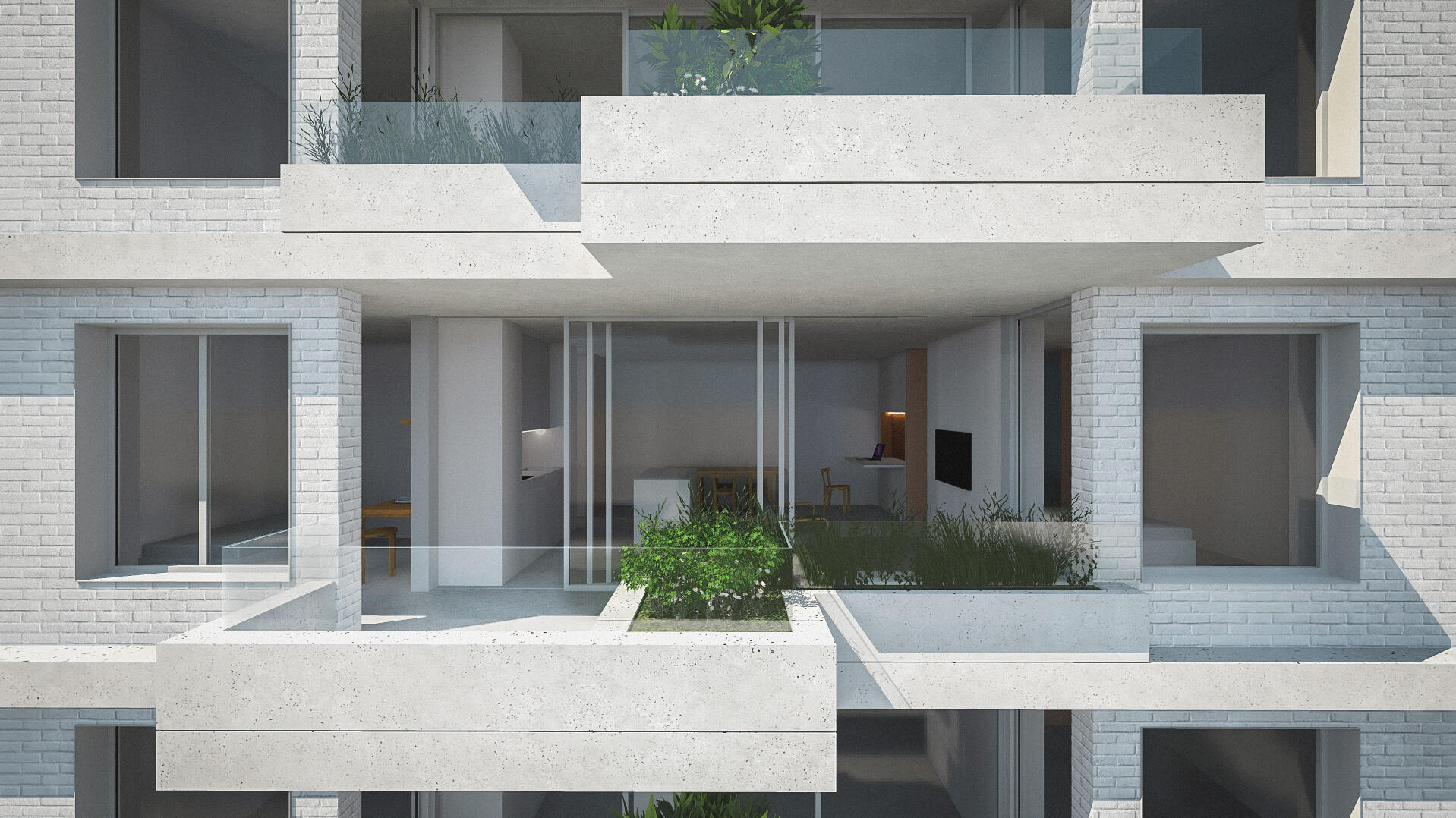 Foram desenvolvidas tipologias T1, T2 e T3, todas com um pressuposto de utilização flexível interior. Através da mobilização de grandes peças de mobiliário/armários que funcionariam como paredes de divisão entre os espaços, seria possível adaptar o uso das habitações a diferentes cenários ao longo do dia. Este projecto surge em pleno contexto de quarentena devido ao Covid19, daí que foi dado grande ênfase ao desenvolvimento de espaços que de algum modo pudessem, além da função de habitação, servir a função de trabalhar em casa, fazer exercício físico e usufruir de um espaço exterior privado. Todos os fogos possuem uma ampla varanda com com espaço para uma mesa de refeições e uma floreira/canteiro que poderia servir de pequena horta doméstica.