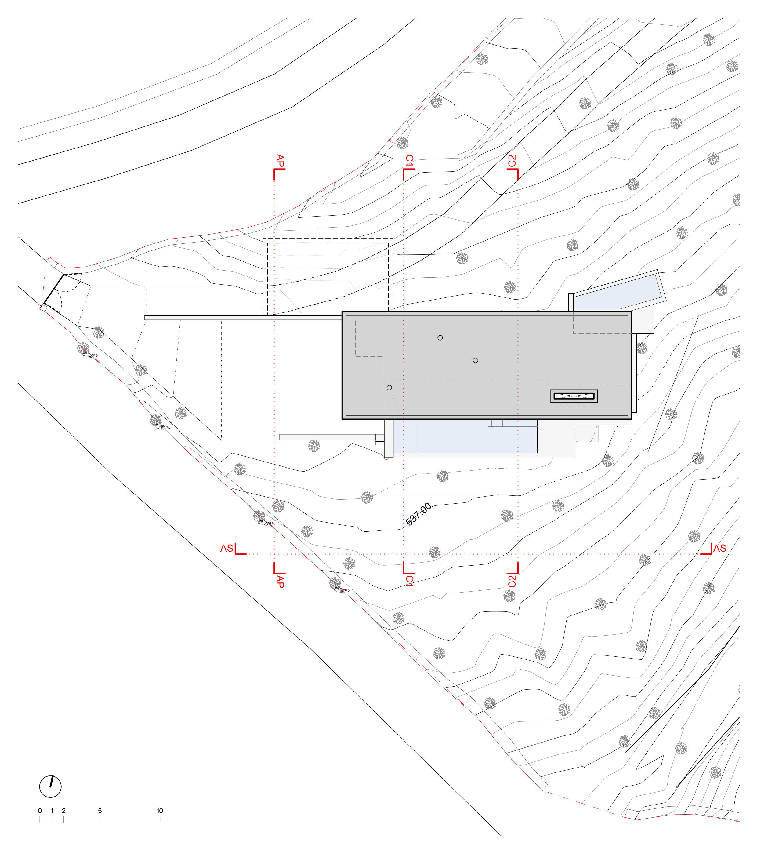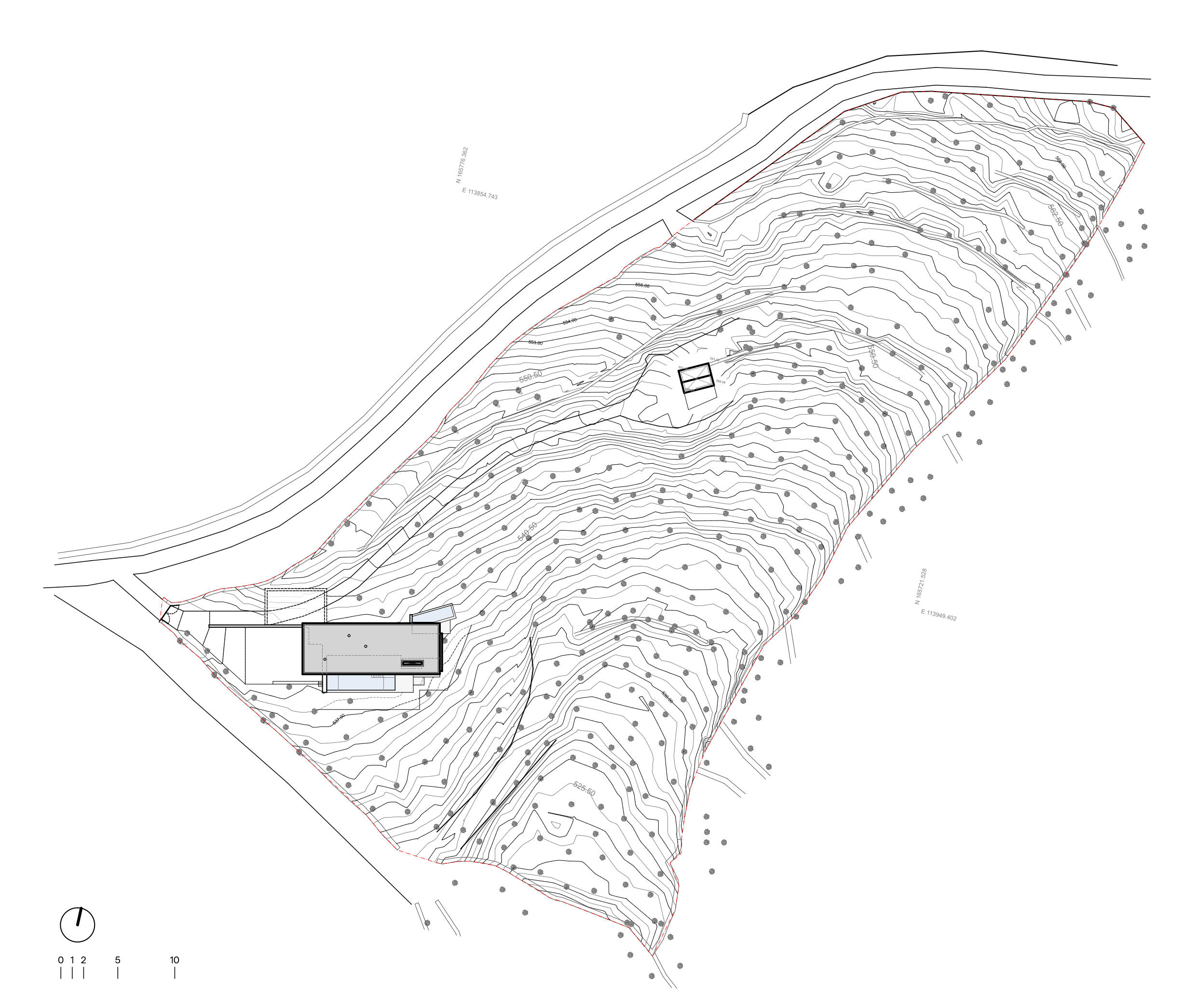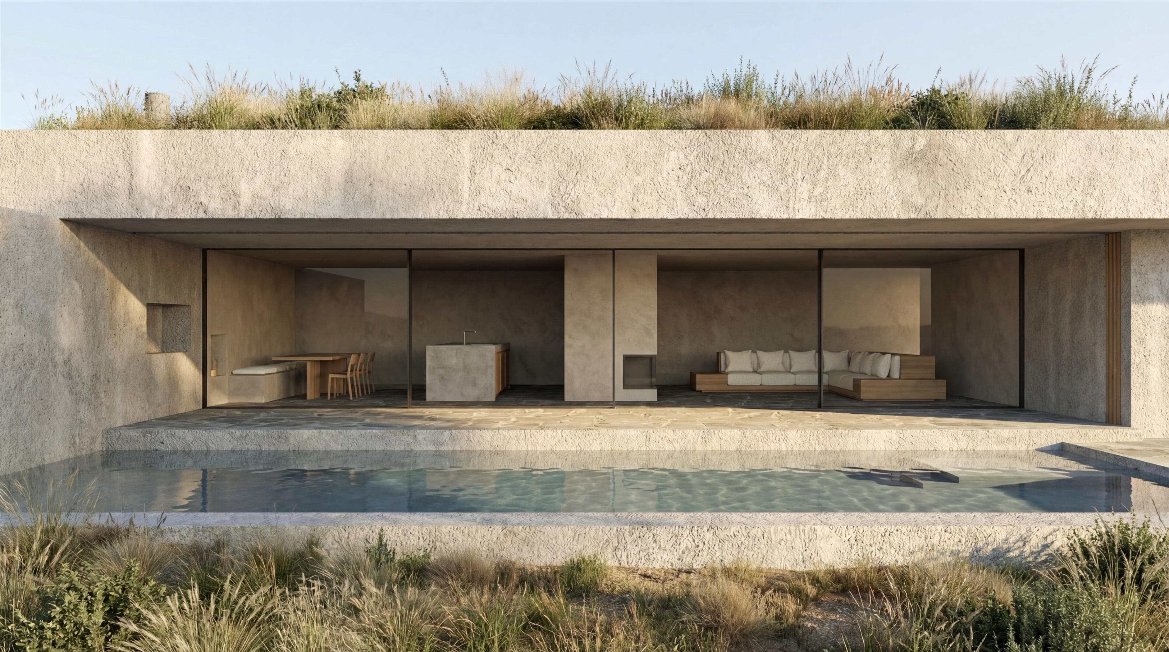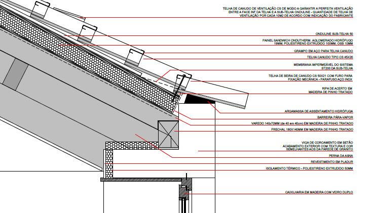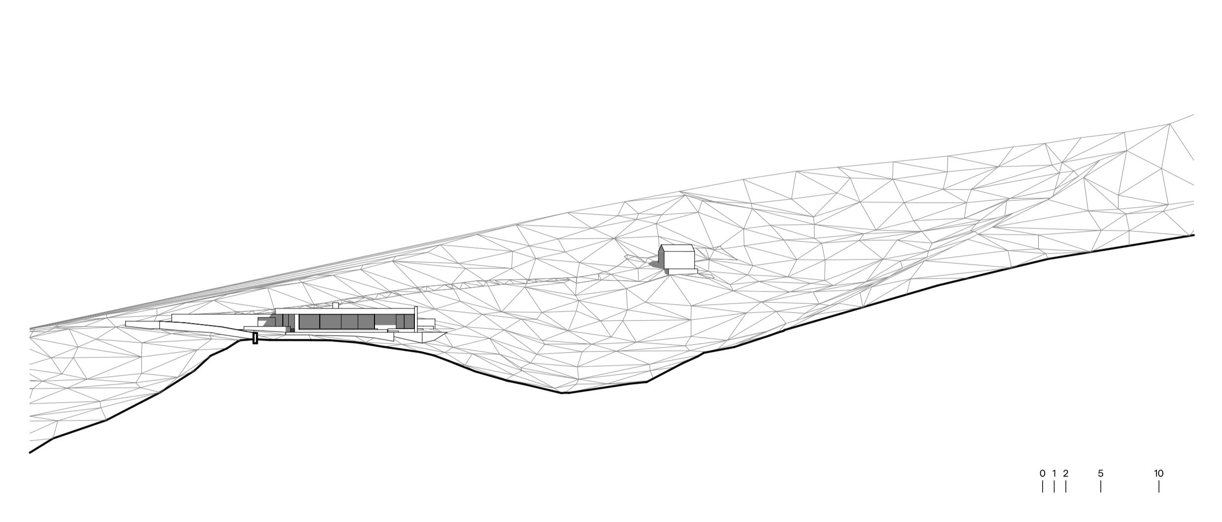 Uma grande laje de betão, apoiada sobre muros, serve de cobertura verde e torna-se uma extensão do terreno. Em vários momentos projecta-se para além da área interior, criando zonas de sombra generosas sobre as fachadas envidraçadas e garantindo que o interior permanece fresco e protegido do sol direto de verão. O betão terá um acabamento lavado a jato de água de alta pressão, tornando-se rugoso e deixando exposto o inerte que o compõe. Com o tempo, ganhará uma patine e tonalidade próximas do terreno envolvente, evocando a imagem de um aglomerado rochoso. Construção e terreno fundem-se assim num único gesto contínuo.