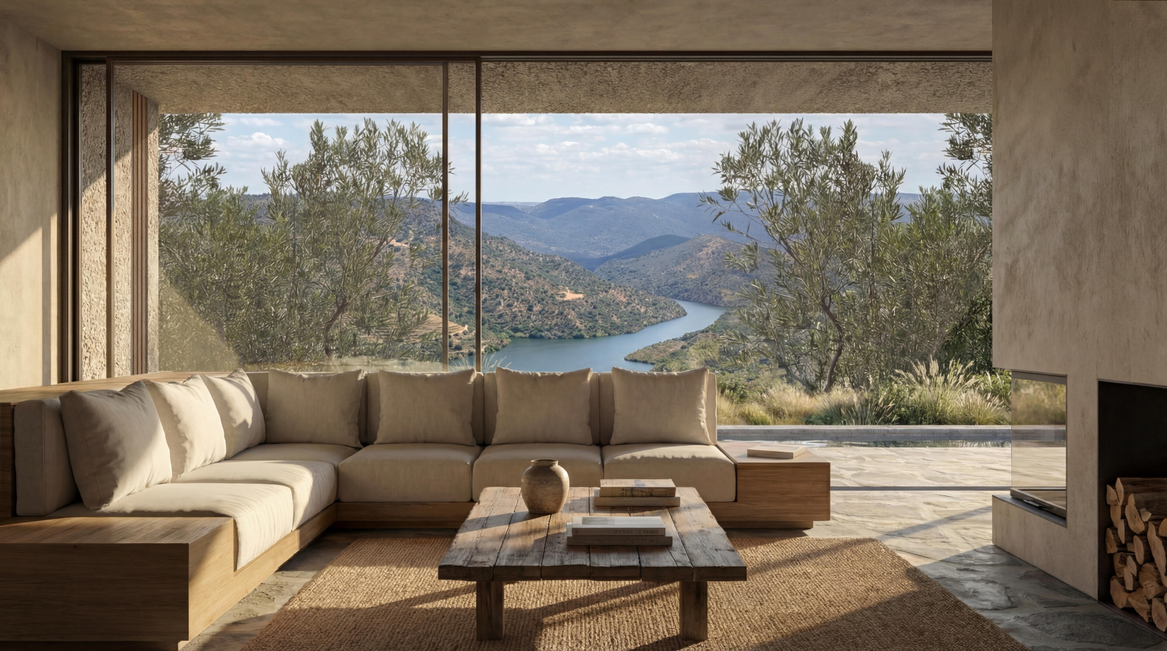 The brief came from a couple who are nature lovers and devoted owners of three dogs. Used to the light of the Vicentine Coast, they sought a weekend retreat in the International Douro. The setting was idyllic yet complex: a terraced plot with centennial vineyards, olive, and almond trees, culminating in a mesmerizing view over the river and the Spanish border. The program was simple—a one-bedroom sanctuary with a 12-meter pool—but the requirement was absolute: total connection with the outdoors.