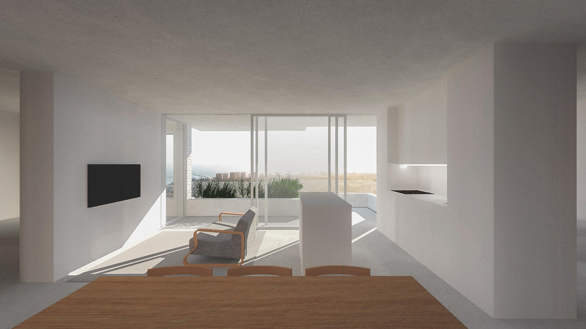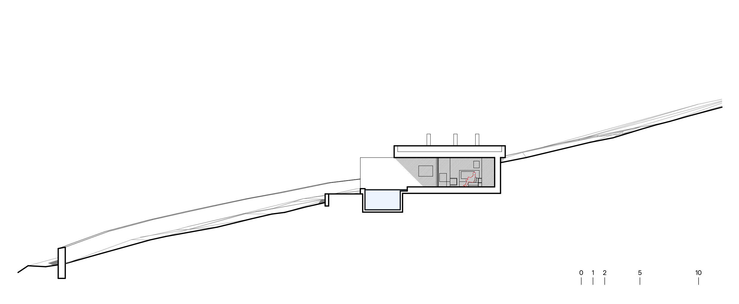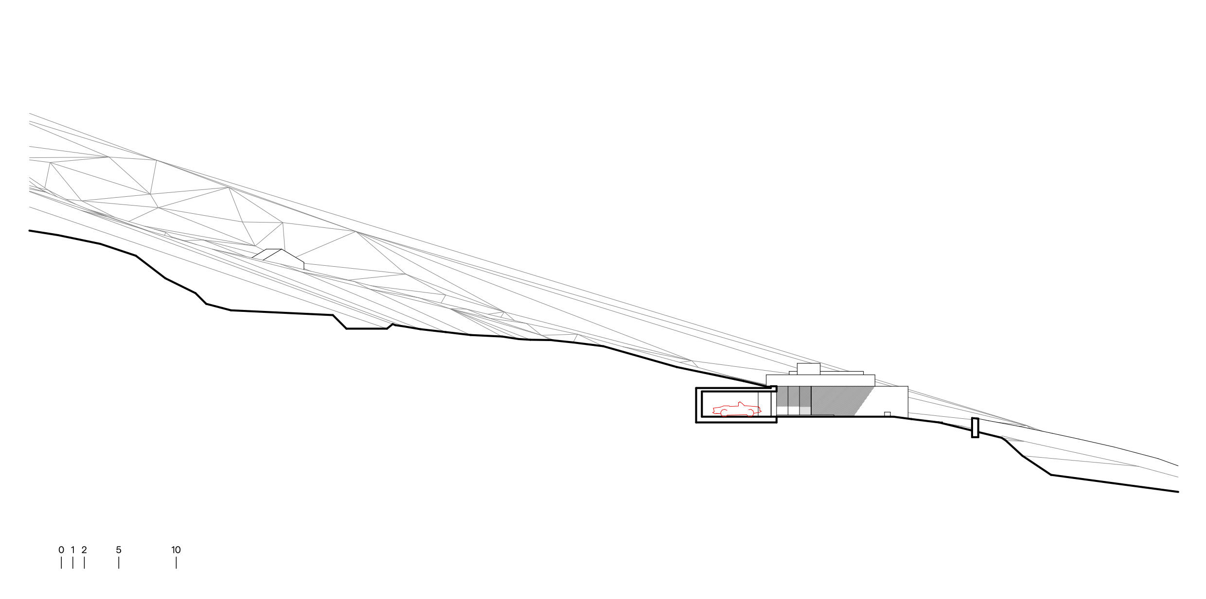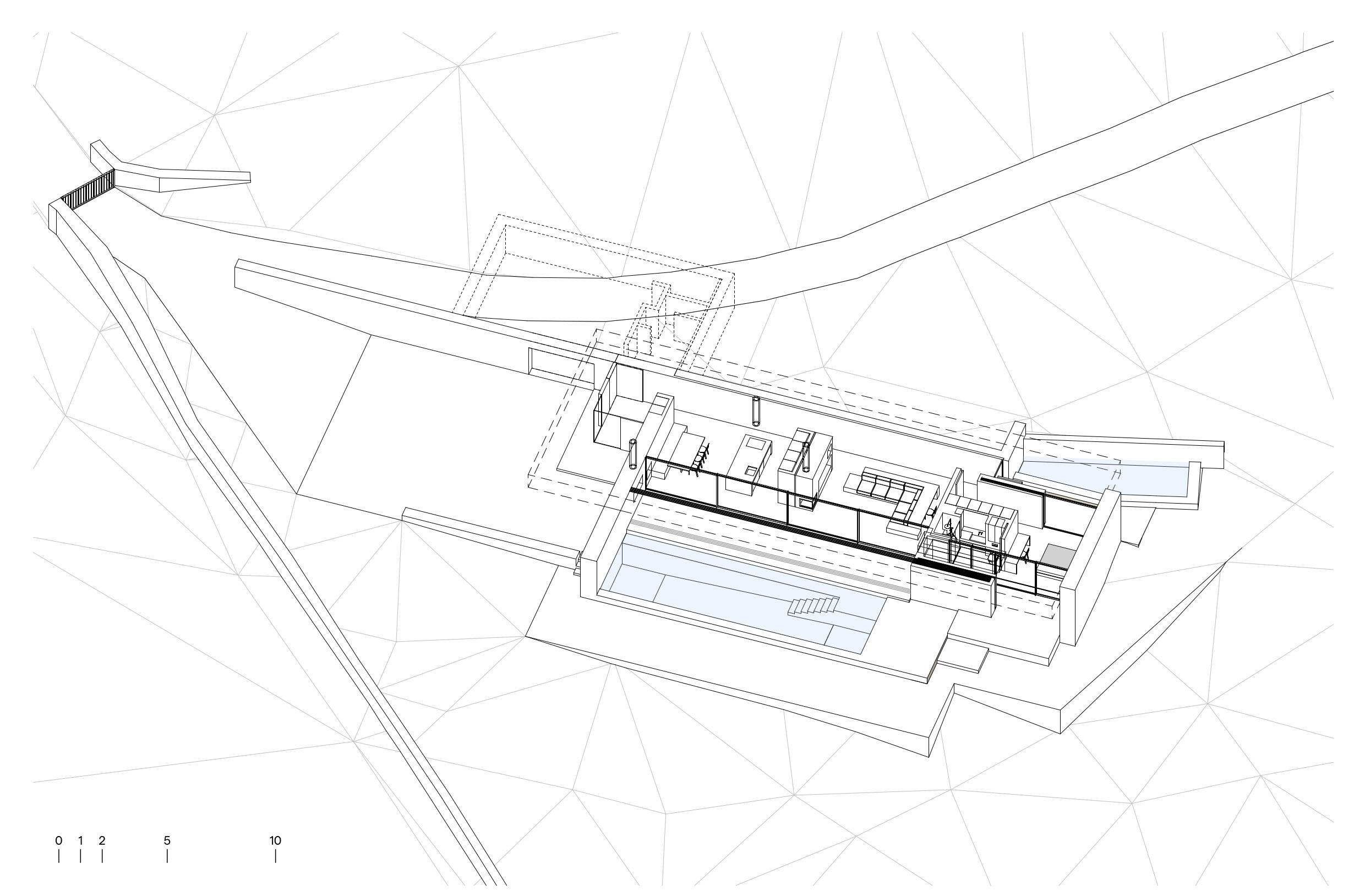 A large concrete slab, resting on retaining walls, serves as a green roof and becomes an extension of the terrain. At several points it projects beyond the interior area, creating generous shaded zones over the glazed facades and ensuring the interior stays cool and protected from the direct summer sun. The concrete will have a high-pressure water-washed finish, becoming rough and exposing the aggregate within. Over time, it will develop a patina and tone close to the surrounding ground, evoking the image of a rocky outcrop. Construction and landscape thus merge into a single continuous gesture.