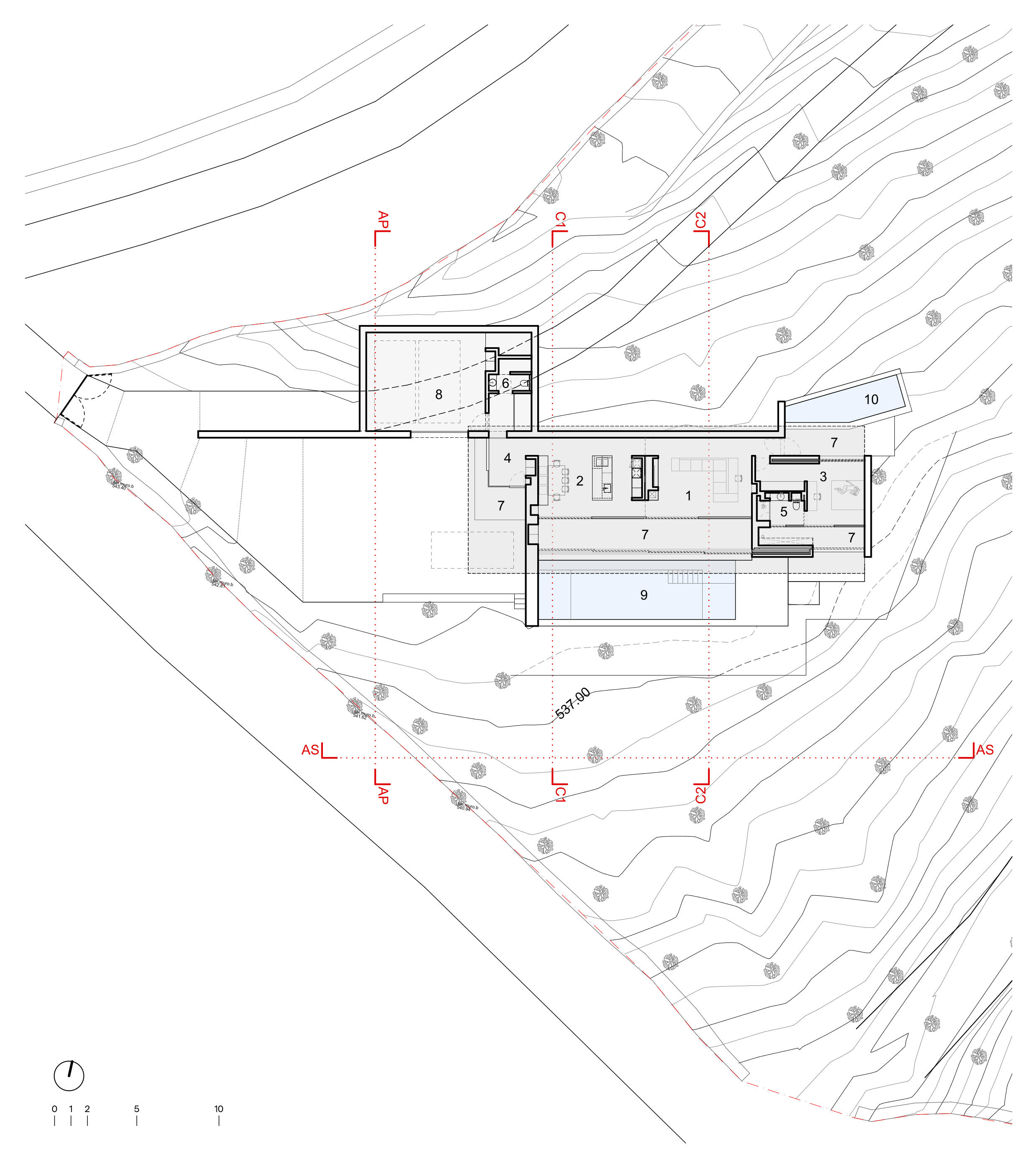 The retaining and boundary walls, as well as the terracing, will be built in schist masonry, maintaining formal coherence with the traditional construction of the region. And to address the concern of wildfires, an invisible shield of sprinklers has been integrated into the roof and the perimeter of the house.