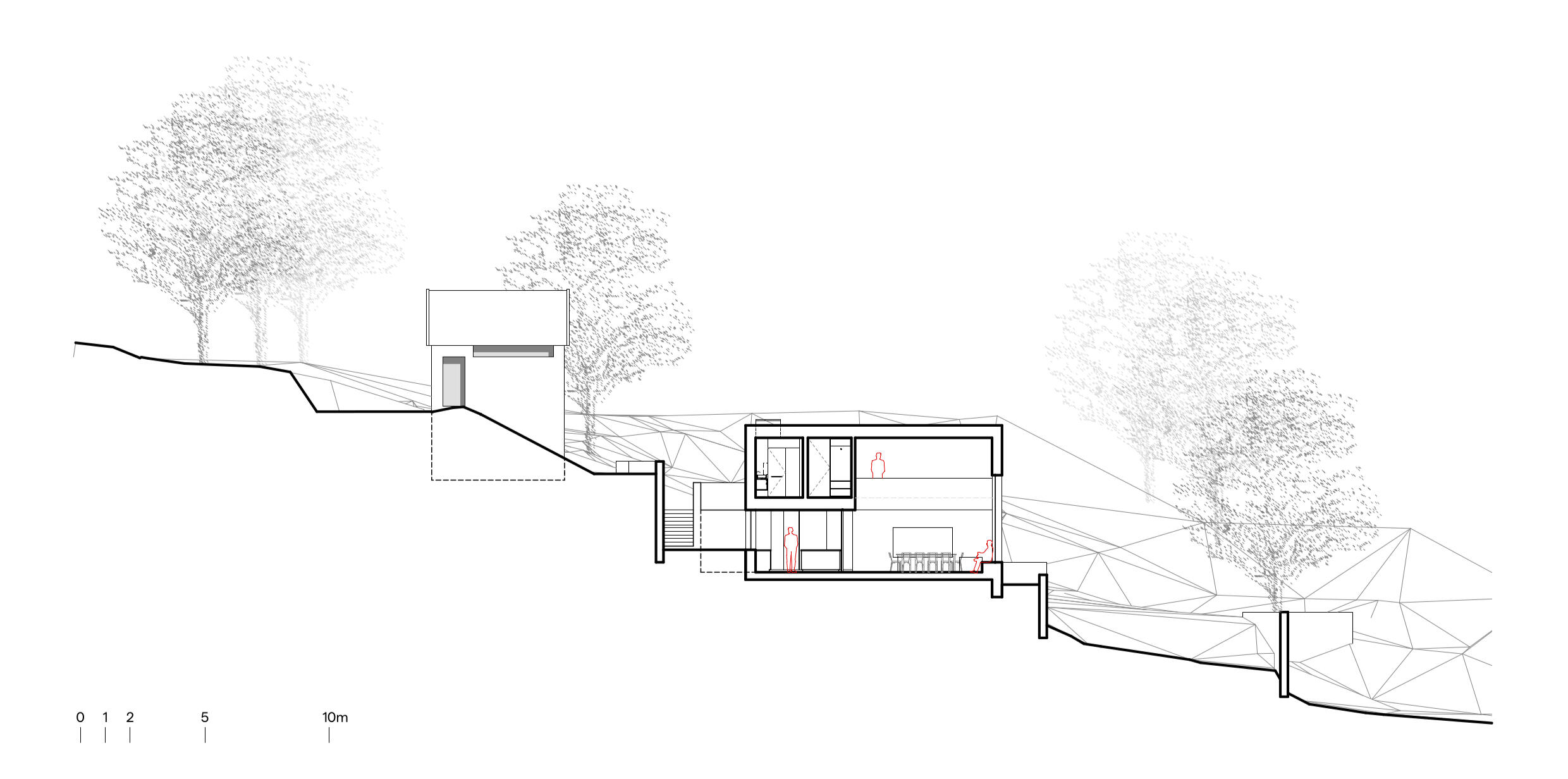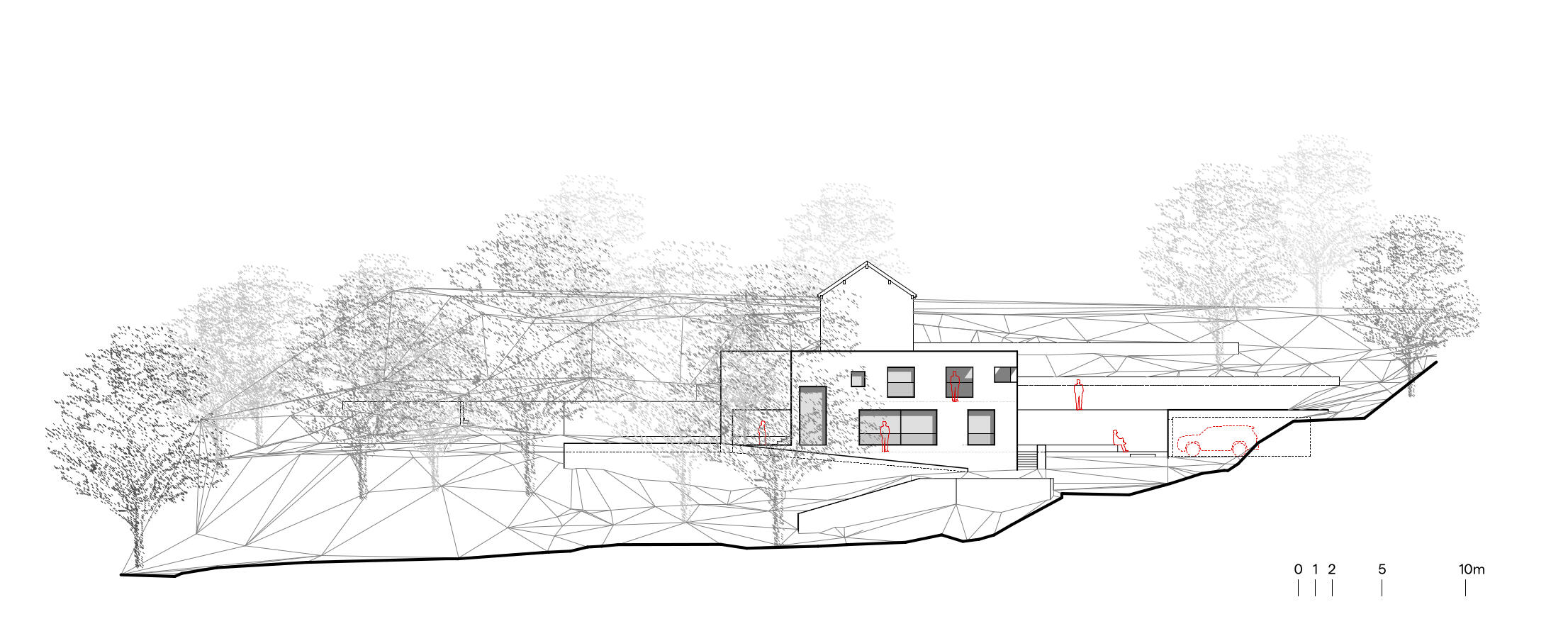 Designing on this site was, from the outset, an exercise in the rigorous acceptance of constraints. Due to regulatory mandates, the new dwelling had to be built exactly within the footprint of the pre-existing ruin. The steep slope posed real physical challenges, making even pedestrian circulation difficult. Furthermore, the central location within the property, far from any public infrastructure, required the creation of private access and an autonomous infrastructure system, including an autonomous septic system.