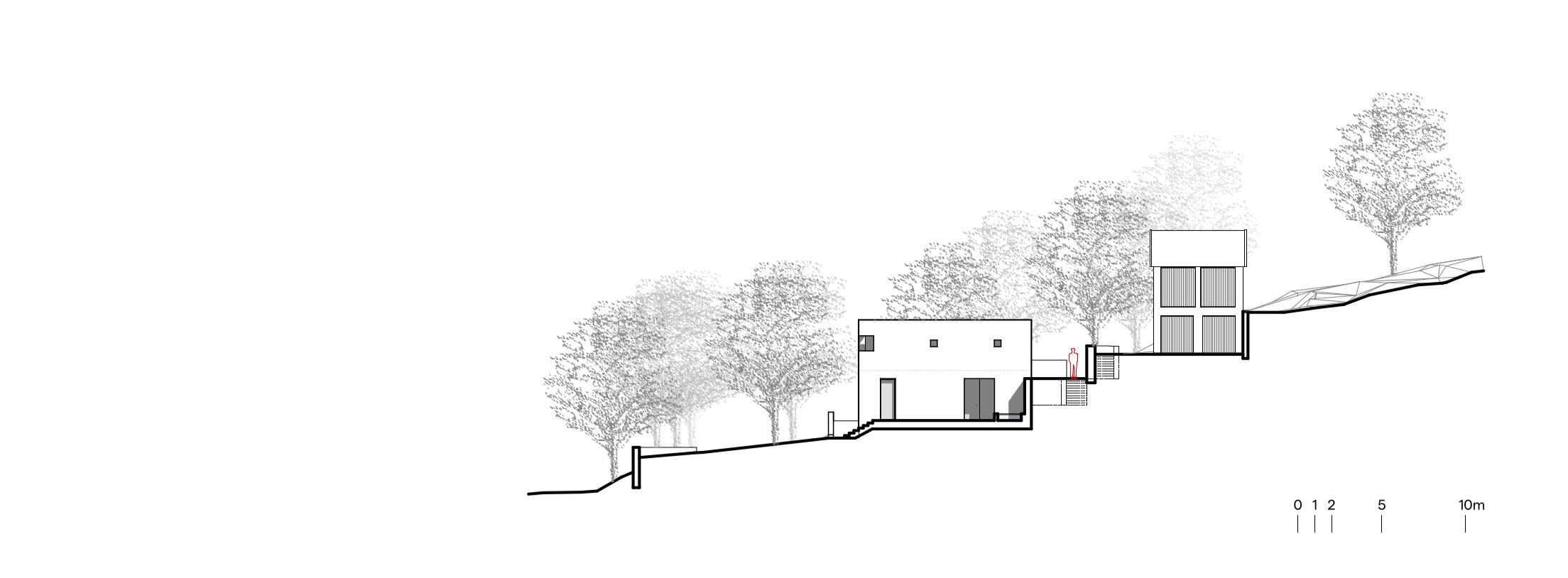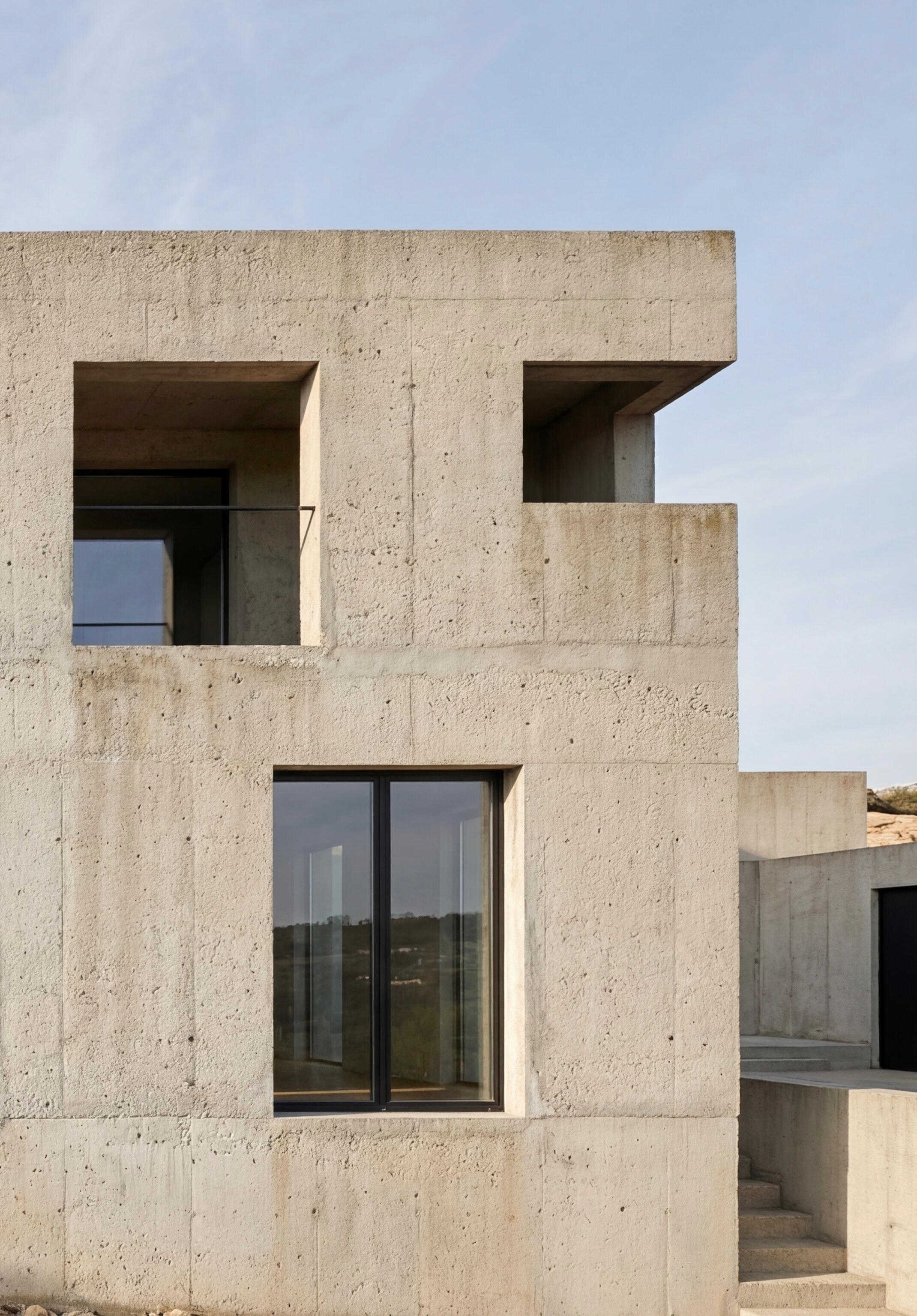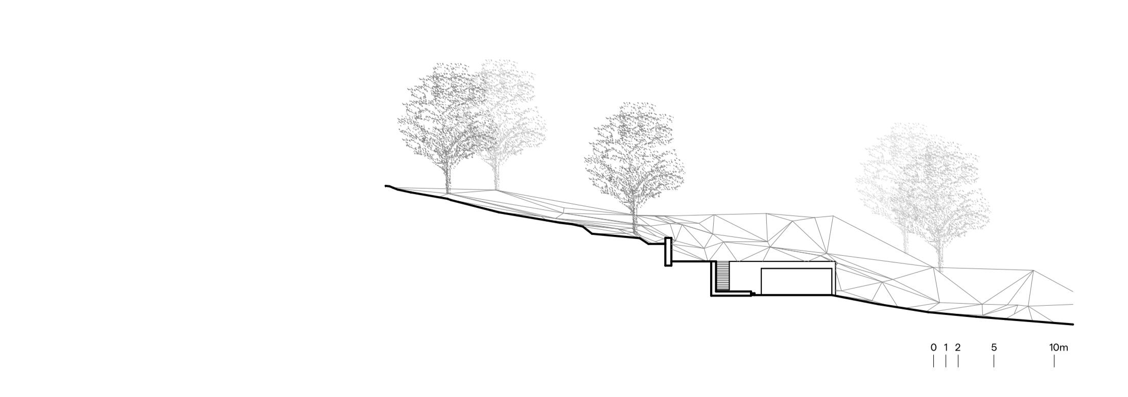 O edifício principal, em betão lavado com inerte granítico, mimetiza a rocha natural, enquanto o anexo agrícola/garagem desaparece lateralmente à moradia, enterrado sob uma cobertura vegetal. Esta solução de coberturas verdes estende-se à própria casa, fazendo com que a construção se dissolva na paisagem.