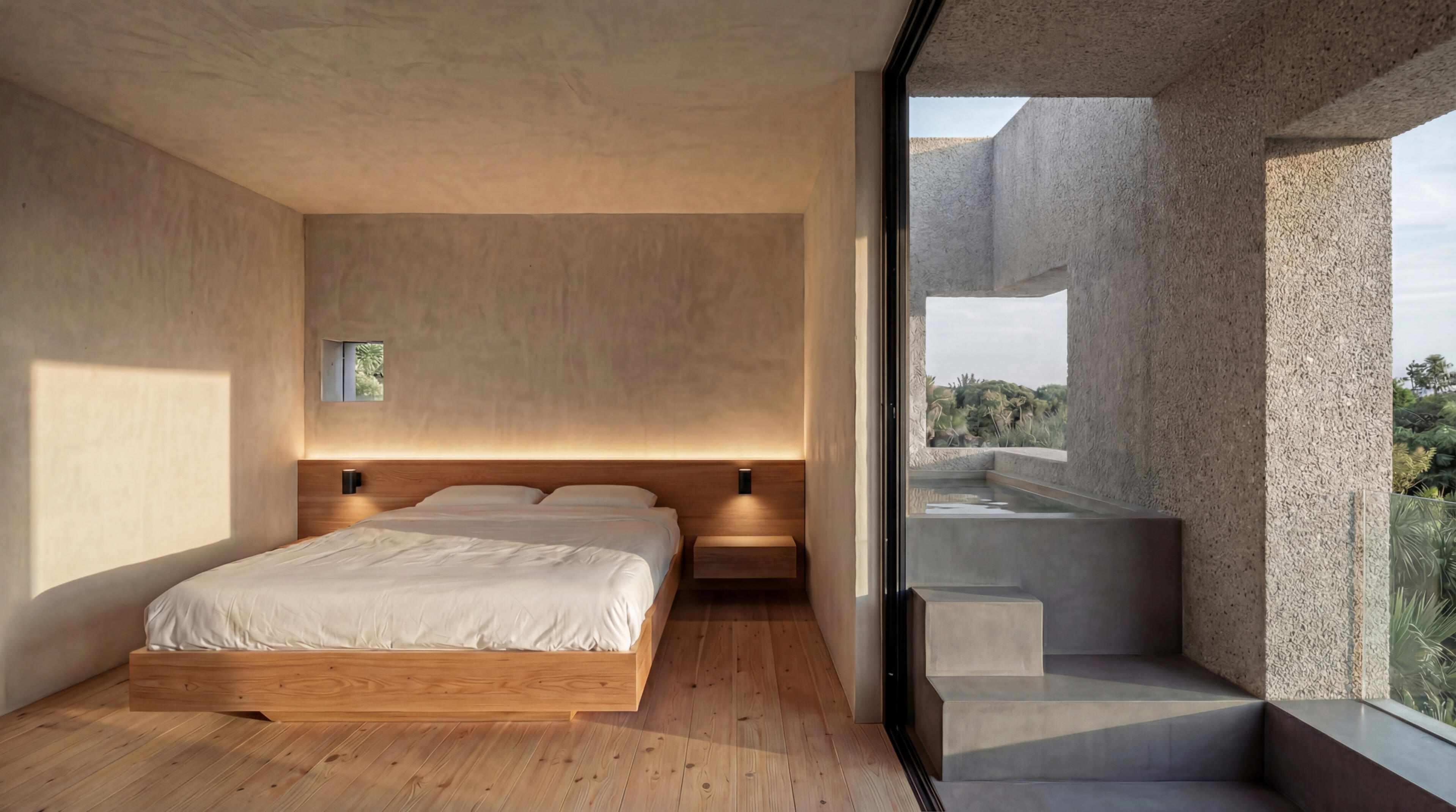 The brief came from a couple who are nature lovers and devoted owners of three dogs. Used to the light of the Vicentine Coast, they sought a weekend retreat in the International Douro. The setting was idyllic yet complex: a terraced plot with centennial vineyards, olive, and almond trees, culminating in a mesmerizing view over the river and the Spanish border. The program was simple — a one-bedroom sanctuary with a 12-meter pool — but the requirement was absolute: total connection with the outdoors.