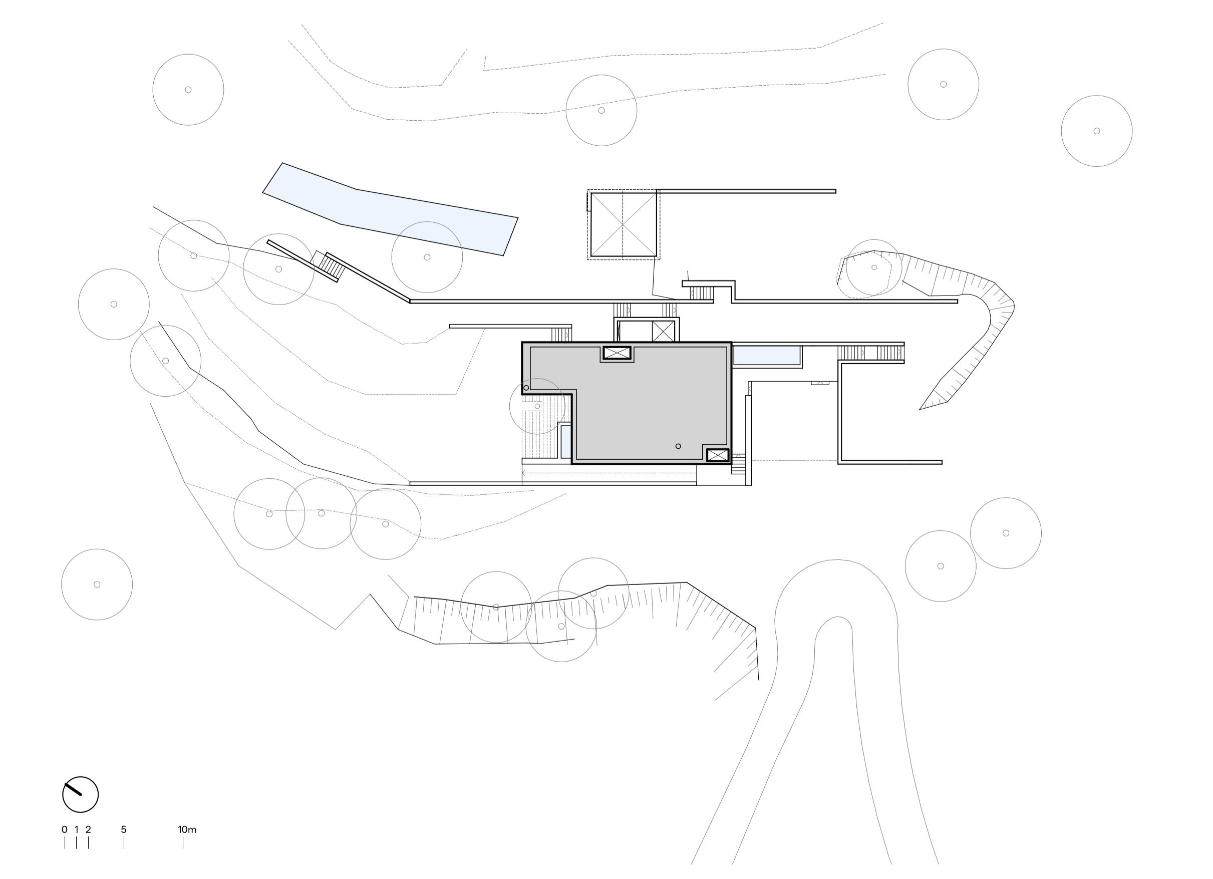 A primeira decisão de projecto foi simbólica: a pedra da ruína seria integralmente reciclada na construção dos novos muros de suporte e socalcos. A pátine do tempo — o musgo e a textura irregular — ficaria preservada em cada bloco, conferindo aos novos muros uma presença já integrada na encosta. Uma rede de muros e escadas em granito articula agora os diferentes socalcos e organiza os percursos, devolvendo ao terreno uma estrutura legível e habitável.